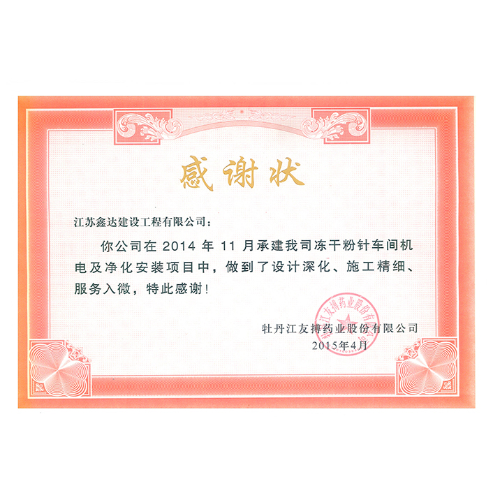 2015年客戶感謝狀(友搏藥業(yè))