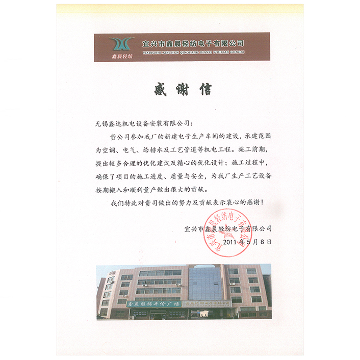 2011年客戶感謝信(鑫晨電子)