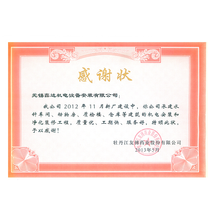 2013年客戶感謝狀(友搏藥業(yè))