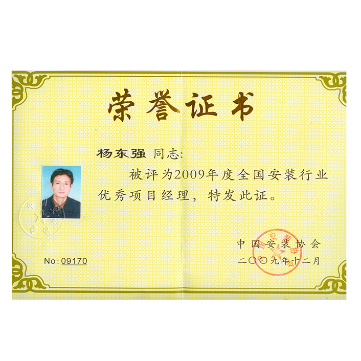 2009年全國(guó)安裝行業(yè)優(yōu)秀項(xiàng)目經(jīng)理(楊東強(qiáng))