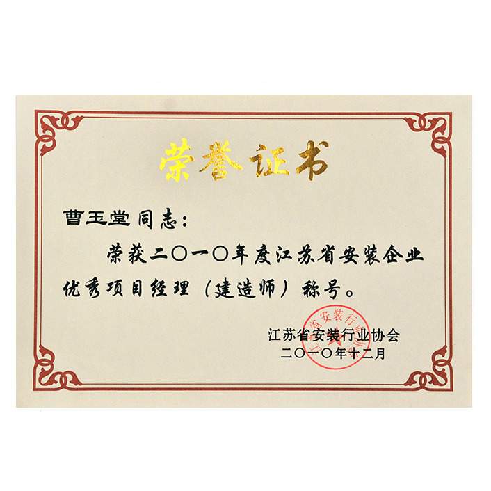 2010年省安裝行業(yè)優(yōu)秀項(xiàng)目經(jīng)理(曹玉堂)