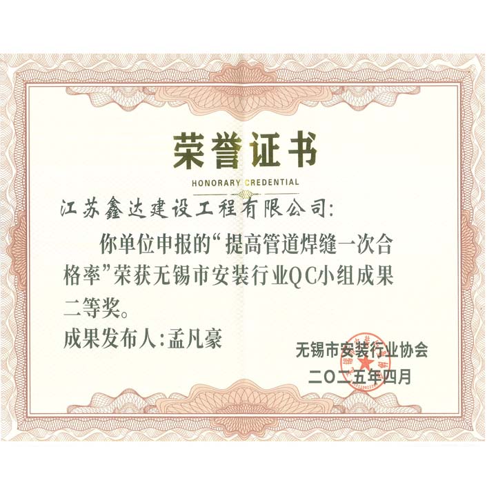 無(wú)錫市安裝行業(yè)QC小組成果二等獎(jiǎng)(孟凡豪)