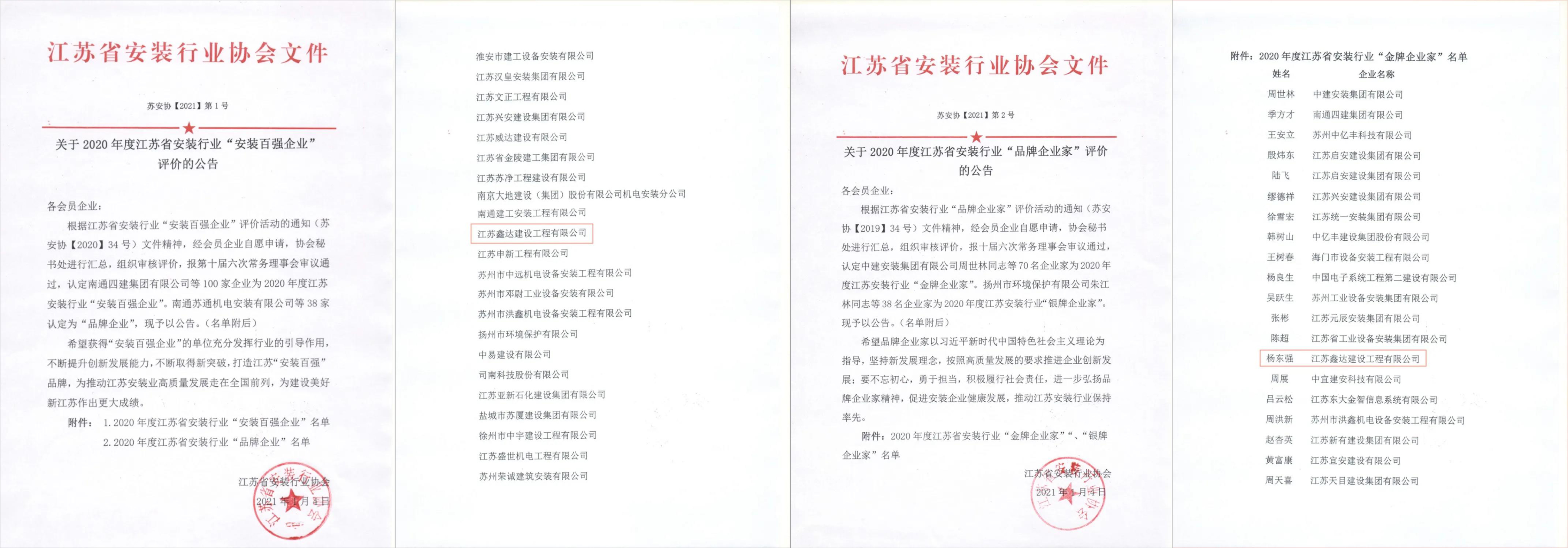 從江蘇省安裝行業(yè)協(xié)會獲悉,2020年度江蘇省安裝行業(yè)“安裝百強企業(yè)”及“品牌企業(yè)家”評選活動結果已經揭曉,全省共有138家單位及108位企業(yè)家獲獎,我司再次榮獲江蘇省安裝行業(yè)協(xié)會“安裝百強企業(yè)”稱號,總經理楊東強榮獲江蘇省安裝行業(yè)協(xié)會“金牌企業(yè)家”稱號。